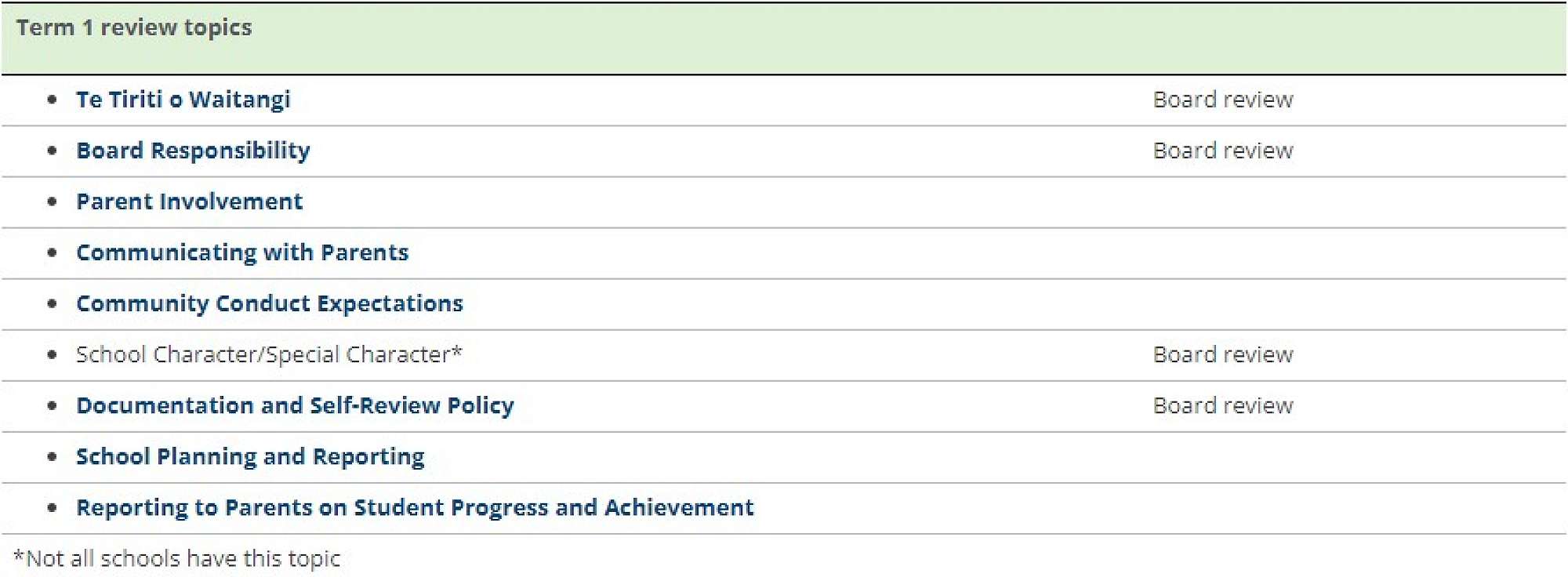 All SchoolDocs schools follow a 3-year review schedule that ensures content stays up to date. Each term, the school community is able to provide feedback on the content and implementation of policies and procedures that are under review. The SchoolDocs team uses feedback from all schools, along with research and external consultation, to make changes to core content. The team notifies schools of any action that is required. • Topics that are under review have a review button, which allows school feedback to be sent to both the school and the SchoolDocs team. • All topics also have a feedback button that can be used to send general feedback or queries about a topic directly to the school.